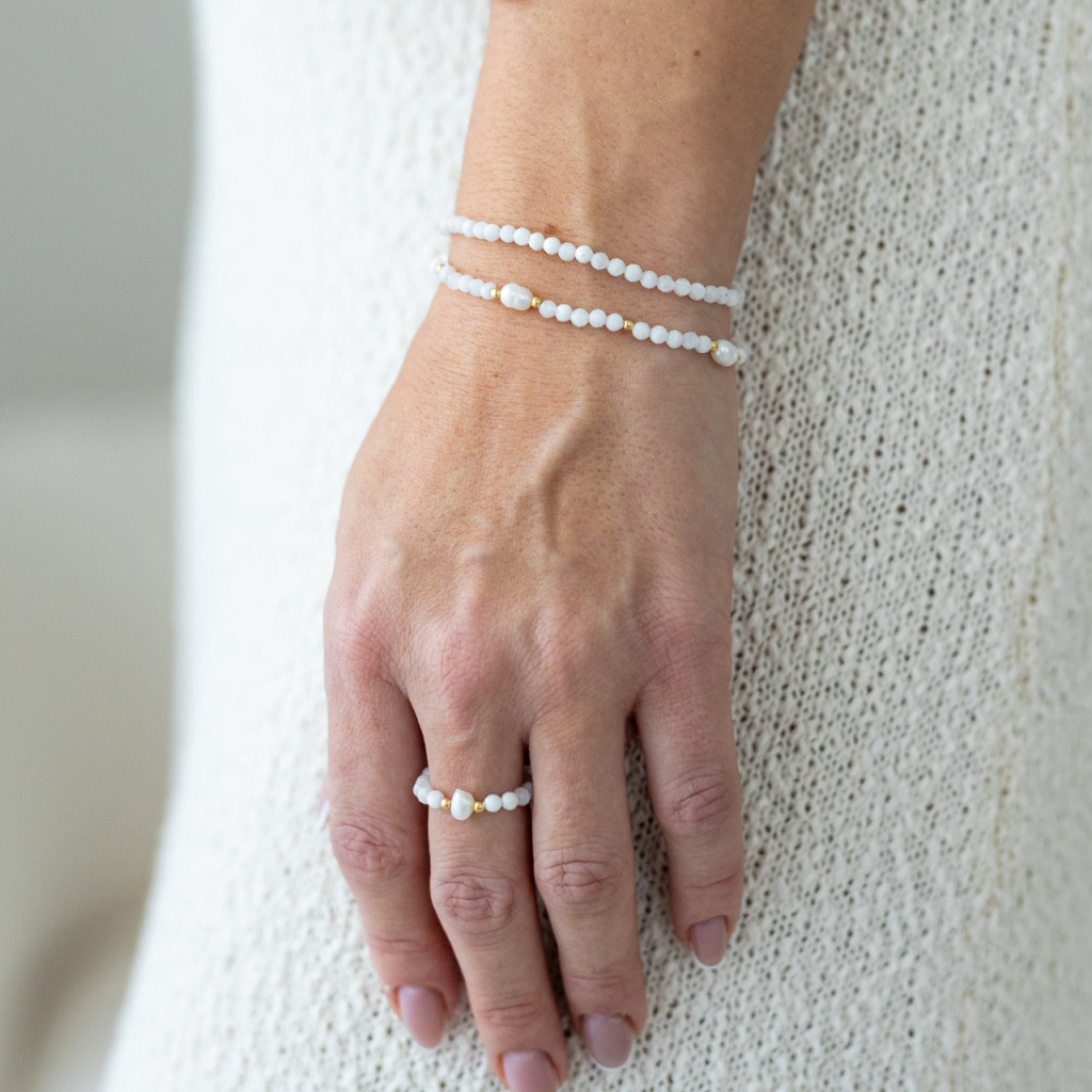 Složení: měsíční kámen, sladkovodní perly, stříbro Ag 925/1000 (pozlac. 18kt zlatem) + navlečeno na pružné lycře