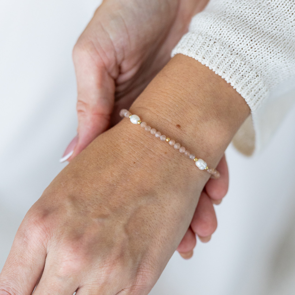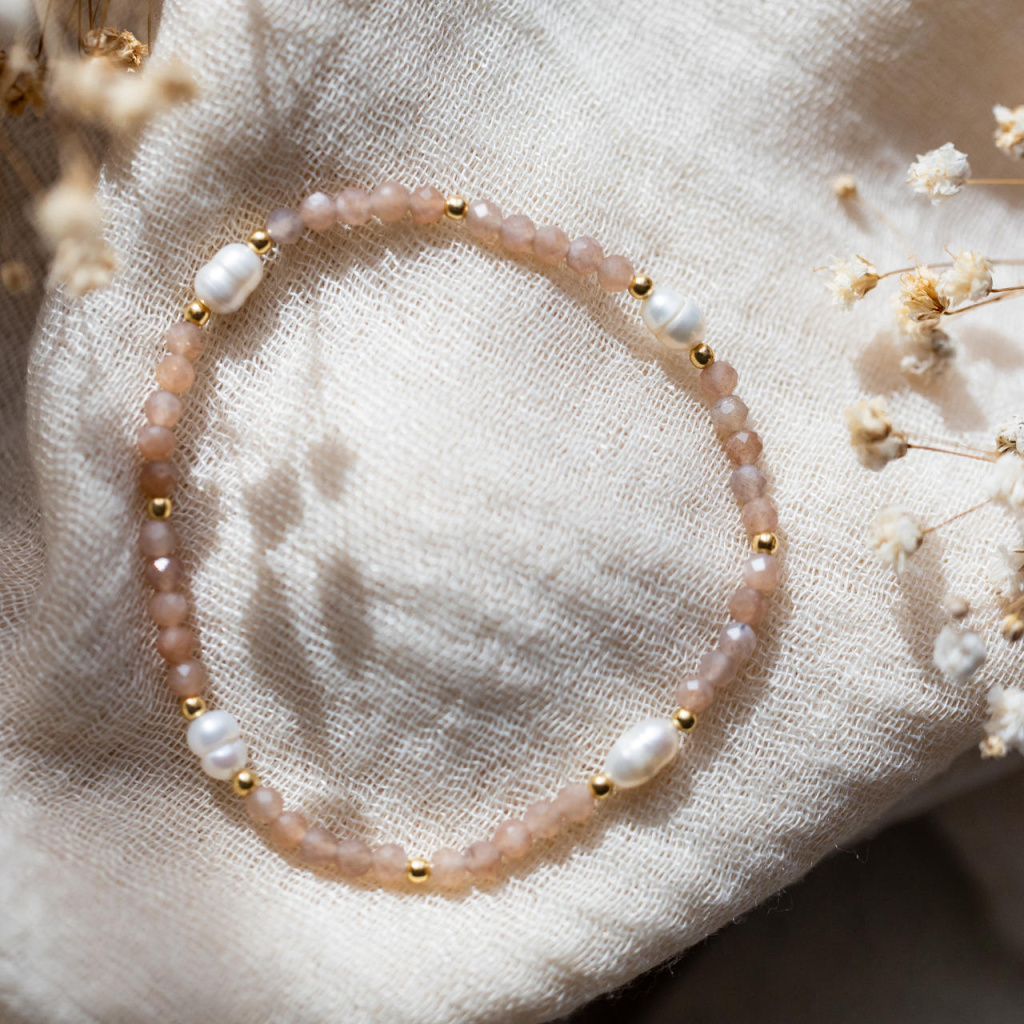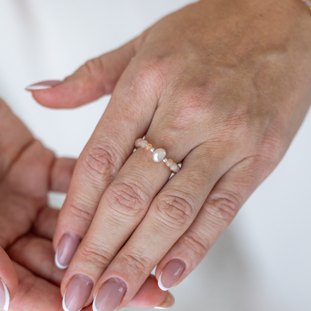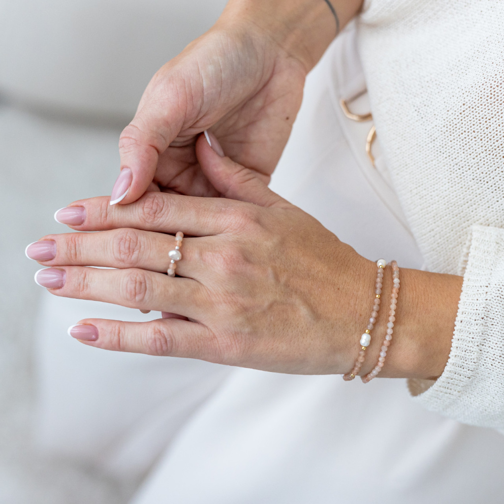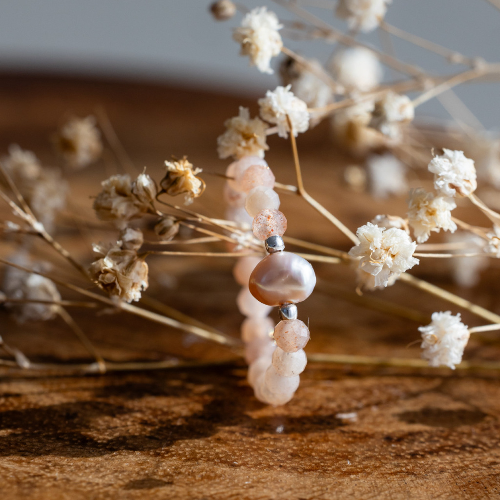 Složení: sluneční kámen, sladkovodní perly, stříbro Ag 925/1000 (pozlac. 18kt zlatem) + navlečeno na pružné lycře