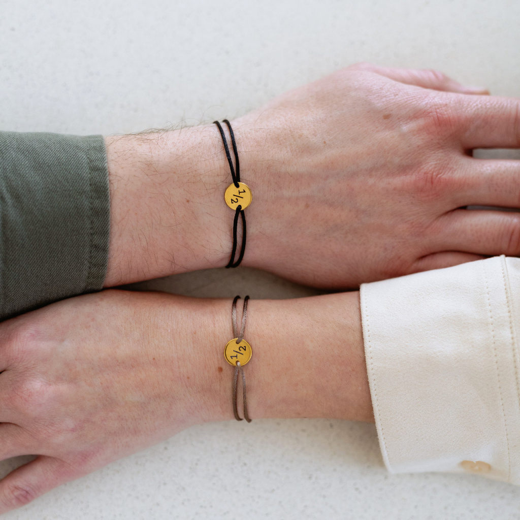 Sada dvou náramků, které jasně deklarují, že jejich majitelé patří k sobě a teprve spolu tvoří celek. Symbol "1/2" je vygravírován na ocelovém žetonku každého z náramků. Nakonfigurujte si ocelové nebo pozlacené provedení komponentu v kombinaci s jedním z devatenácti odstínů saténové šňůrky. Náramky jsou opatřeny posuvnými uzlíky pro částečnou regulaci velikosti.