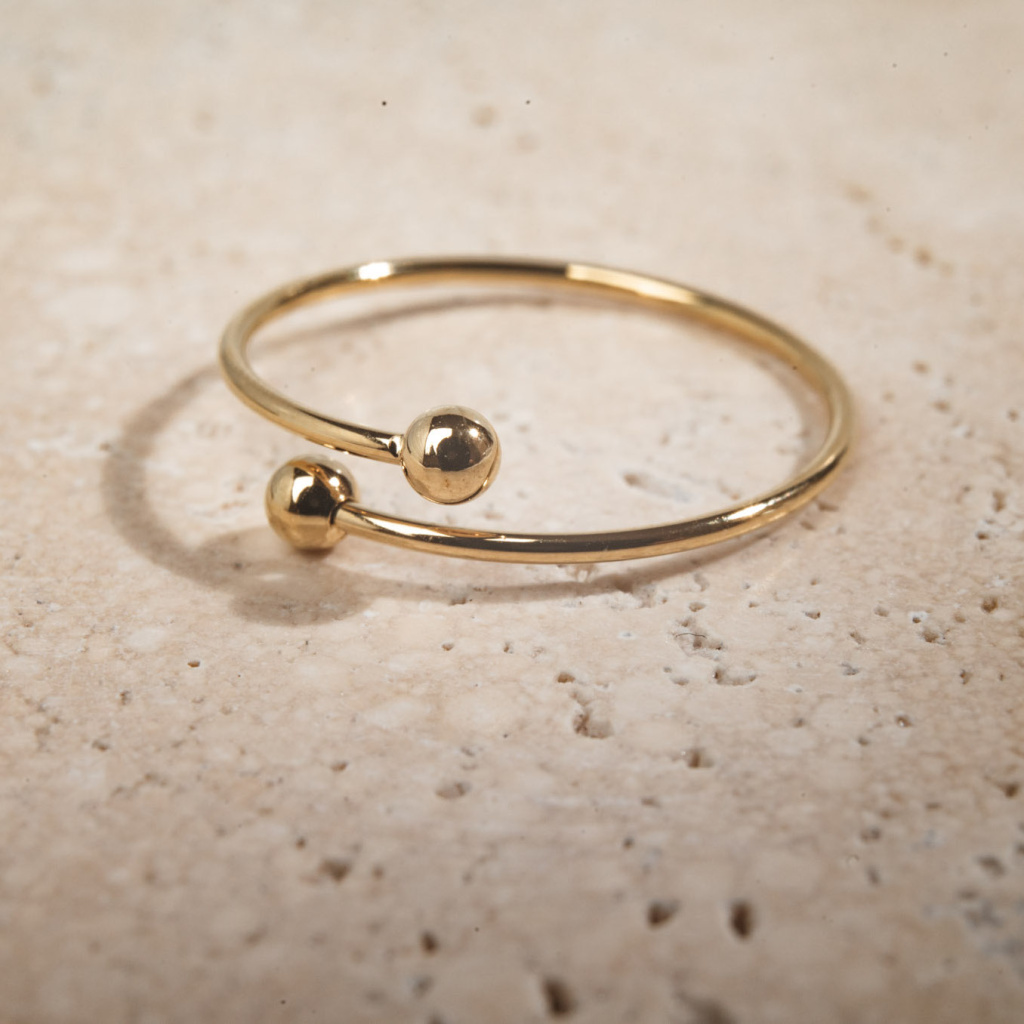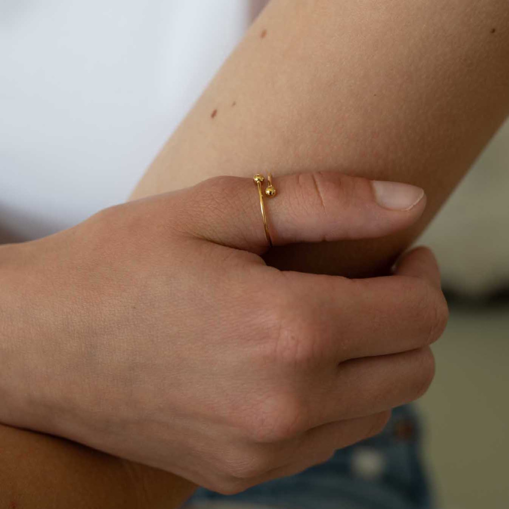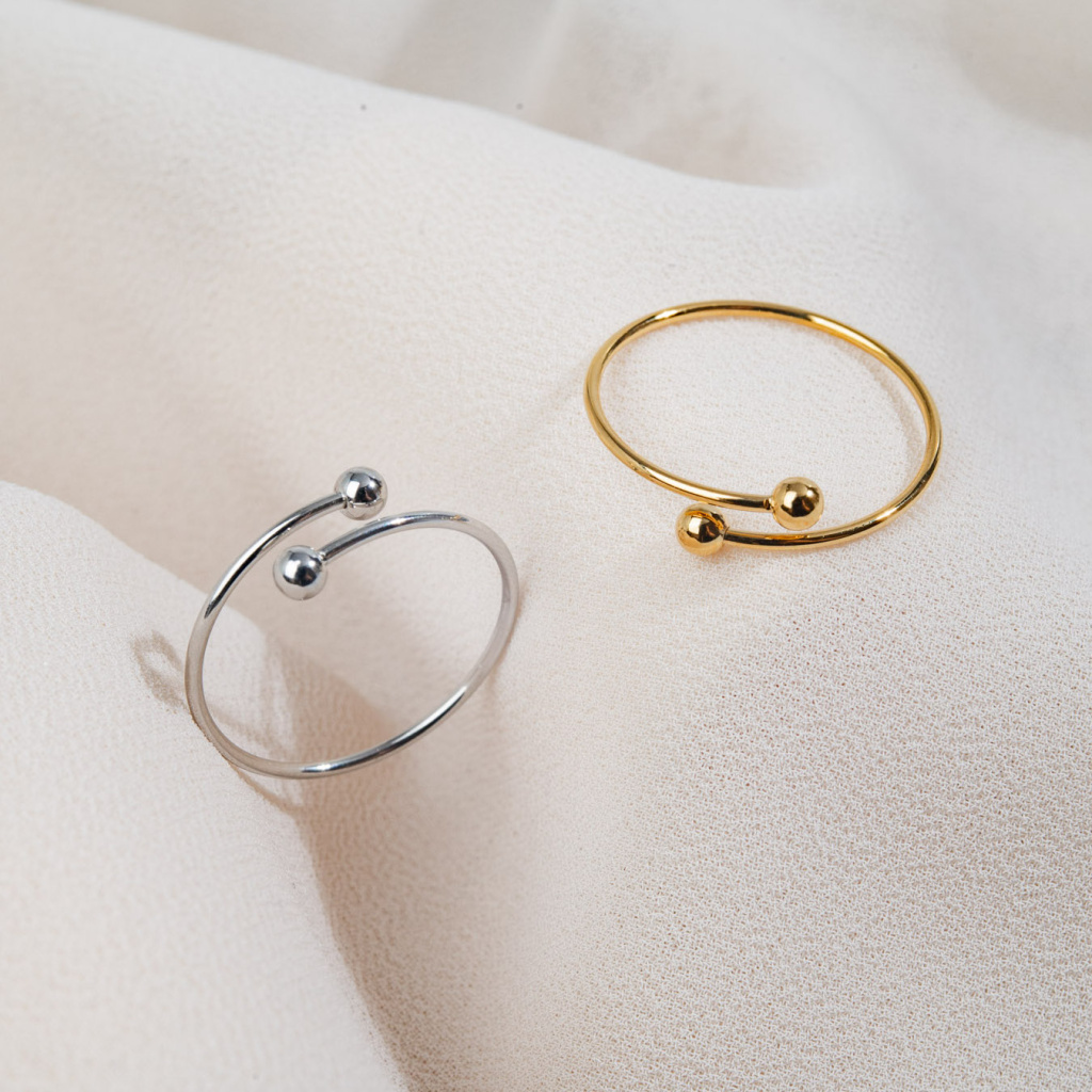 Nastavitelný ocelový prsten se dvěma kuličkami - pozlacený