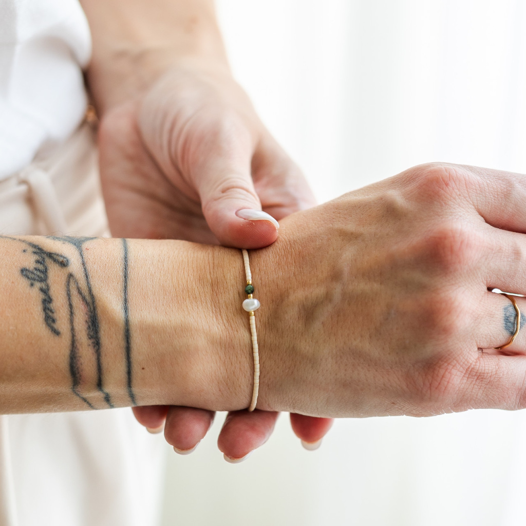 Použité materiály: Miyuki korálky + smaragd + sladkovodní perla - nylonový provázek (drhané utahování s volnými konci)