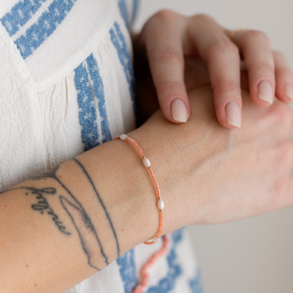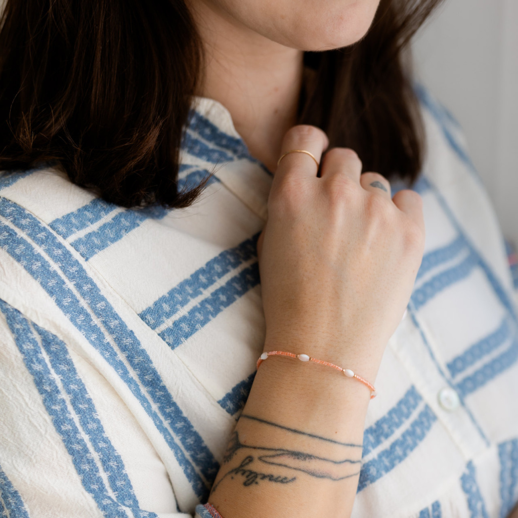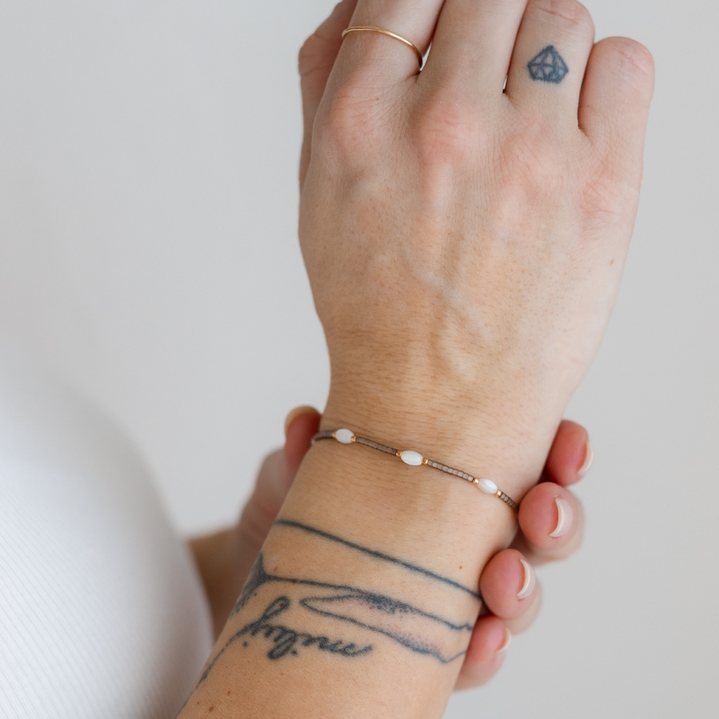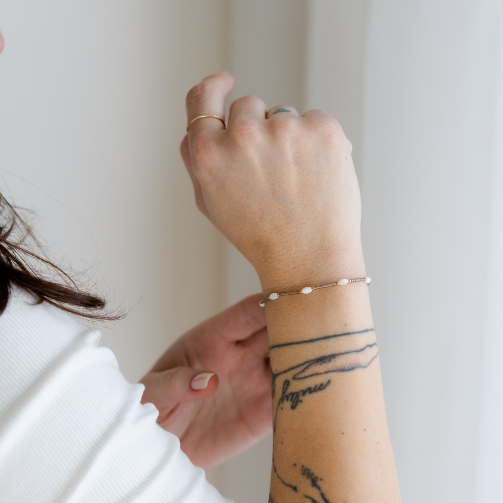 Použité materiály: Miyuki korálky + komponent z perleti + stříbro Ag 925/1000, příp. pozlac. 18kt žlutým nebo růžovým zlatem + nylonový provázek