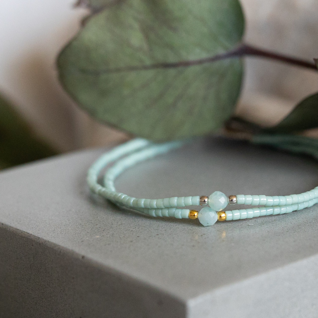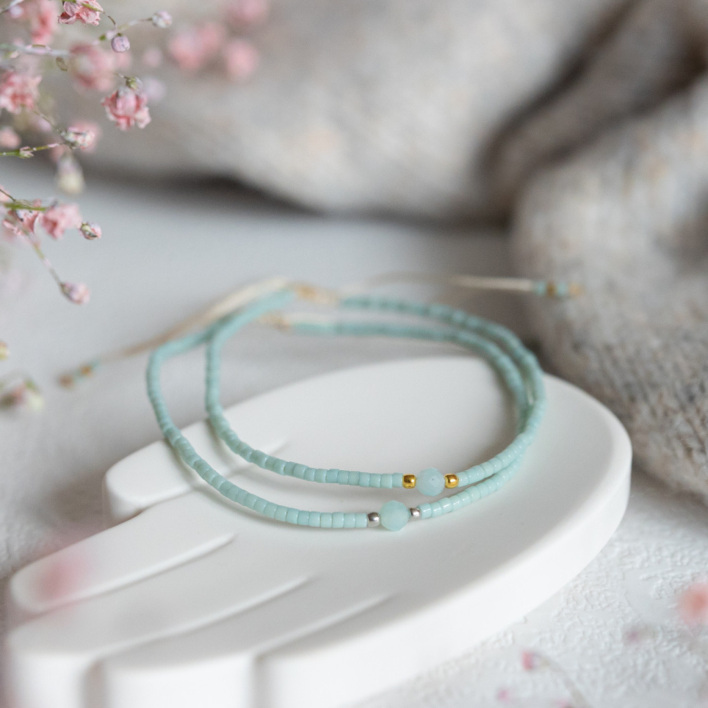 Použité materiály: Miyuki korálky + amazonit + nylonový provázek (drhané utahování s volnými konci)