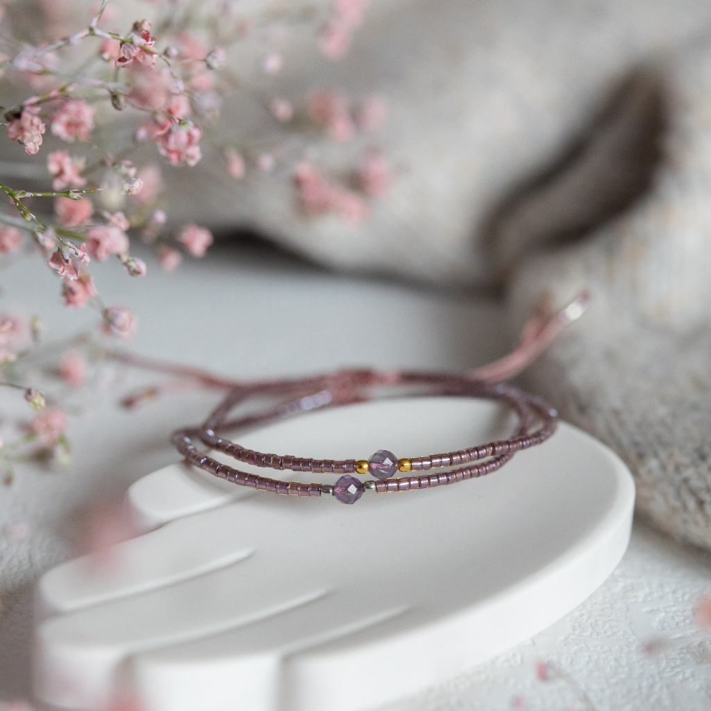 Použité materiály: Miyuki korálky + ametyst + nylonový provázek (drhané utahování s volnými konci)